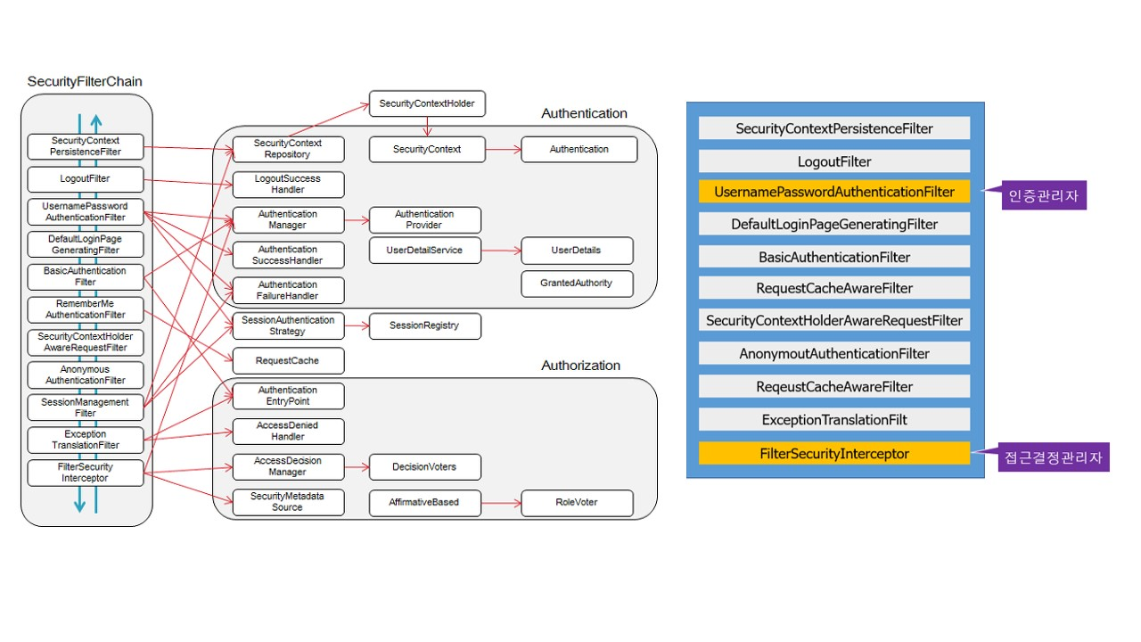 spring Security는 다음과 같이 여러 필터들이 서로 연결되어 인증/인가를 처리한다.