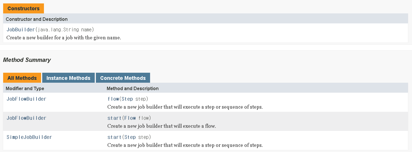 API문서를 보면, Job, Step에 대한 Execution을 생성하거나/ 이것들의 정보를 확인할 수 있는 등의 Method들이 존재한다는 것을 알 수 있다.